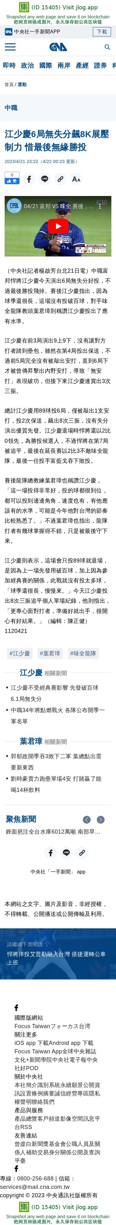 江少慶6局無失分飆8K展壓制力 惜最後無緣勝投 | 運動 | 中央社 CNA