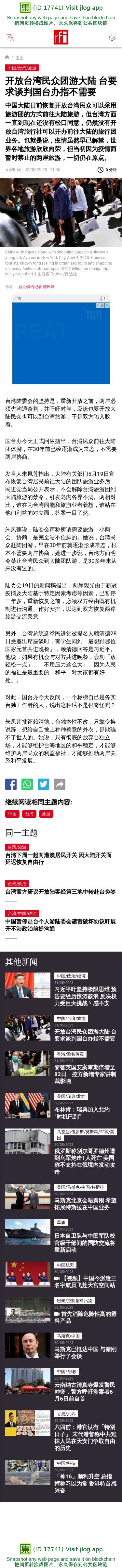 新闻原始地址:https://www.rfi.fr/cn/%E4%B8%AD%E5%9B%BD/20230531-%E5%BC%80%E6%94%BE%E5%8F%B0%E6%B9%BE%E6%B0%91%E4%BC%97%E5%9B%A2%E6%B8%B8%E5%A4%A7%E9%99%86%E5%8F%B0%E8%A6%81%E6%B1%82%E8%B0%88%E5%88%A4%E5%9B%BD%E5%8F%B0%E5%8A%9E%E6%8C%87%E4%B8%8D%E9%9C%80%E8%A6%81