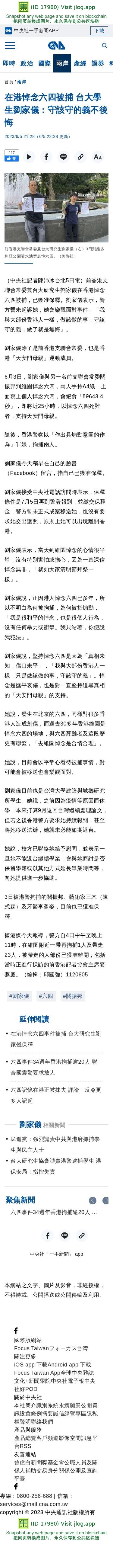 在港悼念六四被捕 台大學生劉家儀:守該守的義不後悔 | 兩岸 | 中央社 CNA