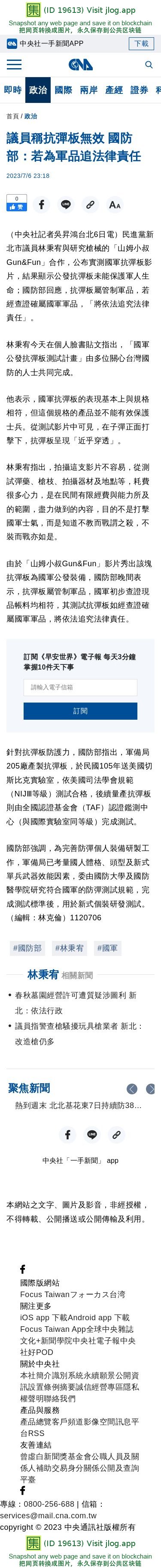 議員稱抗彈板無效 國防部:若為軍品追法律責任 | 政治 | 中央社 CNA