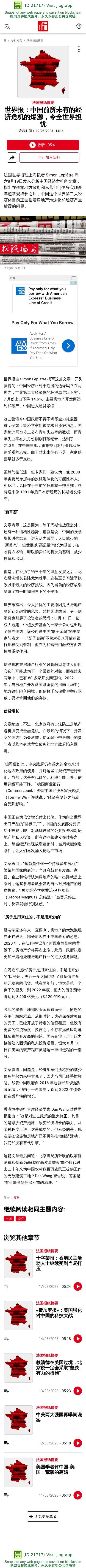 新闻原始地址:https://www.rfi.fr/cn/%E4%B8%93%E6%A0%8F%E6%A3%80%E7%B4%A2/%E6%B3%95%E5%9B%BD%E6%8A%A5%E7%BA%B8%E6%91%98%E8%A6%81/20230819-%E4%B8%96%E7%95%8C%E6%8A%A5-%E4%B8%AD%E5%9B%BD%E7%88%86%E5%8F%91%E5%89%8D%E6%89%80%E6%9C%AA%E6%9C%89%E7%9A%84%E7%BB%8F%E6%B5%8E%E5%8D%B1%E6%9C%BA%EF%BC%8C%E4%BB%A4%E5%85%A8%E4%B8%96%E7%95%8C%E6%8B%85%E5%BF%A7