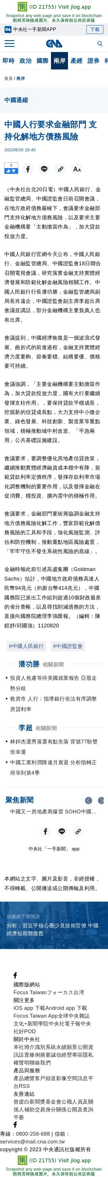 中國人行要求金融部門 支持化解地方債務風險 | 兩岸 | 中央社 CNA