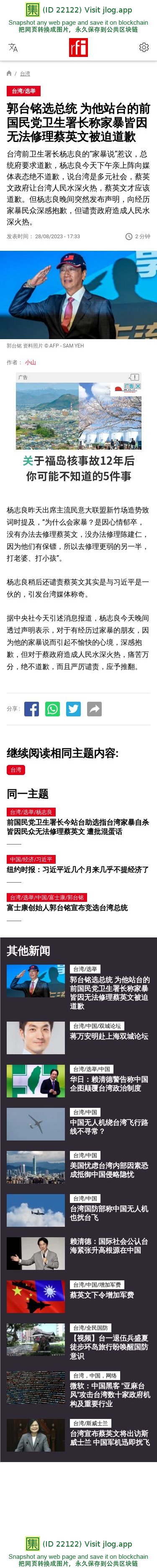 新闻原始地址:https://www.rfi.fr/cn/%E5%8F%B0%E6%B9%BE/20230828-%E9%83%AD%E5%8F%B0%E9%93%AD%E9%80%89%E6%80%BB%E7%BB%9F-%E4%B8%BA%E4%BB%96%E7%AB%99%E5%8F%B0%E7%9A%84%E5%89%8D%E5%9B%BD%E6%B0%91%E5%85%9A%E5%8D%AB%E7%94%9F%E7%BD%B2%E9%95%BF%E7%A7%B0%E5%AE%B6%E6%9A%B4%E7%9A%86%E5%9B%A0%E6%97%A0%E6%B3%95%E4%BF%AE%E7%90%86%E8%94%A1%E8%8B%B1%E6%96%87%E8%A2%AB%E8%BF%AB%E9%81%93%E6%AD%89