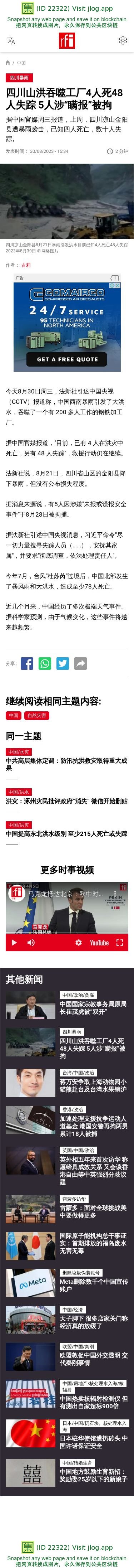 新闻原始地址:https://www.rfi.fr/cn/%E4%B8%AD%E5%9B%BD/20230830-%E5%9B%9B%E5%B7%9D%E5%B1%B1%E6%B4%AA%E5%90%9E%E5%99%AC%E5%B7%A5%E5%8E%824%E4%BA%BA%E6%AD%BB48%E4%BA%BA%E5%A4%B1%E8%B8%AA-5%E4%BA%BA%E6%B6%89-%E7%9E%92%E6%8A%A5-%E8%A2%AB%E6%8B%98