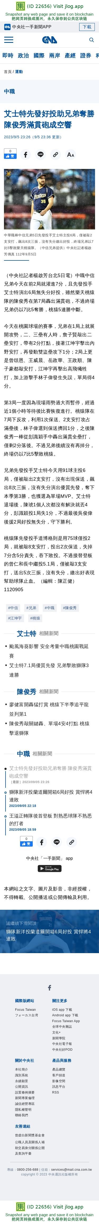 艾士特先發好投助兄弟奪勝 陳俊秀滿貫砲成空響 | 運動 | 中央社 CNA