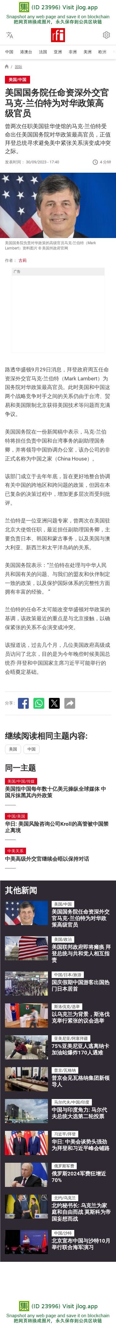 新闻原始地址:https://www.rfi.fr/cn/%E5%9B%BD%E9%99%85/20230930-%E7%BE%8E%E5%9B%BD%E5%9B%BD%E5%8A%A1%E9%99%A2%E4%BB%BB%E5%91%BD%E8%B5%84%E6%B7%B1%E5%A4%96%E4%BA%A4%E5%AE%98%E9%A9%AC%E5%85%8B-%E5%85%B0%E4%BC%AF%E7%89%B9%E4%B8%BA%E5%AF%B9%E5%8D%8E%E6%94%BF%E7%AD%96%E9%AB%98%E7%BA%A7%E5%AE%98%E5%91%98