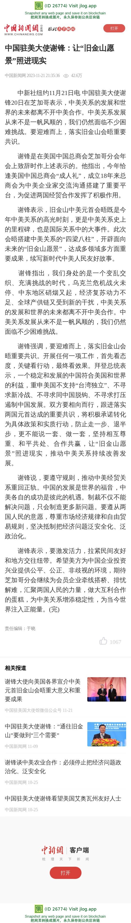 中国驻美大使谢锋:让“旧金山愿景”照进现实