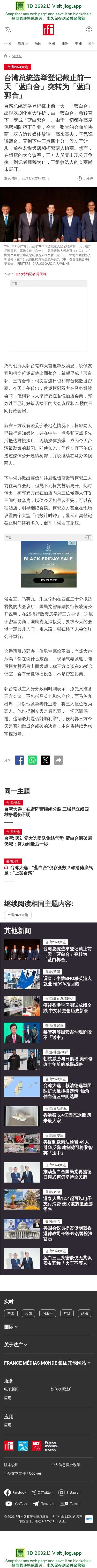 新闻原始地址:https://www.rfi.fr/cn/%E6%B8%AF%E6%BE%B3%E5%8F%B0/20231123-%E5%8F%B0%E6%B9%BE%E6%80%BB%E7%BB%9F%E9%80%89%E4%B8%BE%E7%99%BB%E8%AE%B0%E6%88%AA%E6%AD%A2%E5%89%8D%E4%B8%80%E5%A4%A9-%E8%93%9D%E7%99%BD%E5%90%88-%E7%AA%81%E8%BD%AC%E4%B8%BA-%E8%93%9D%E7%99%BD%E9%83%AD%E5%90%88