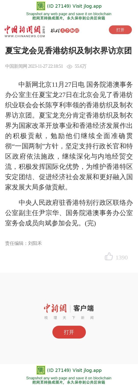 夏宝龙会见香港纺织及制衣界访京团