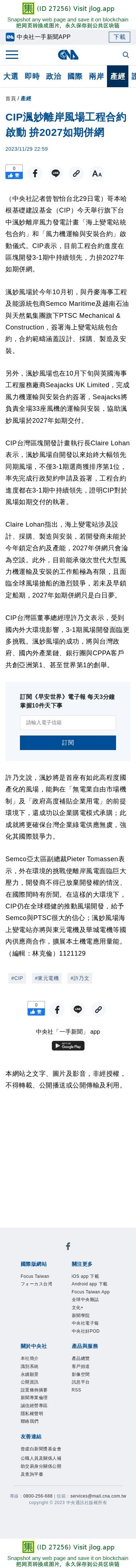 CIP渢妙離岸風場工程合約啟動 拚2027如期併網 | 產經 | 中央社 CNA