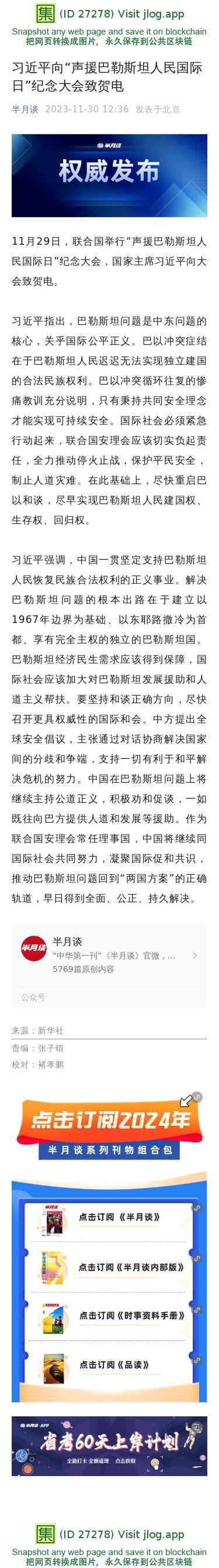 习近平向“声援巴勒斯坦人民国际日”纪念大会致贺电