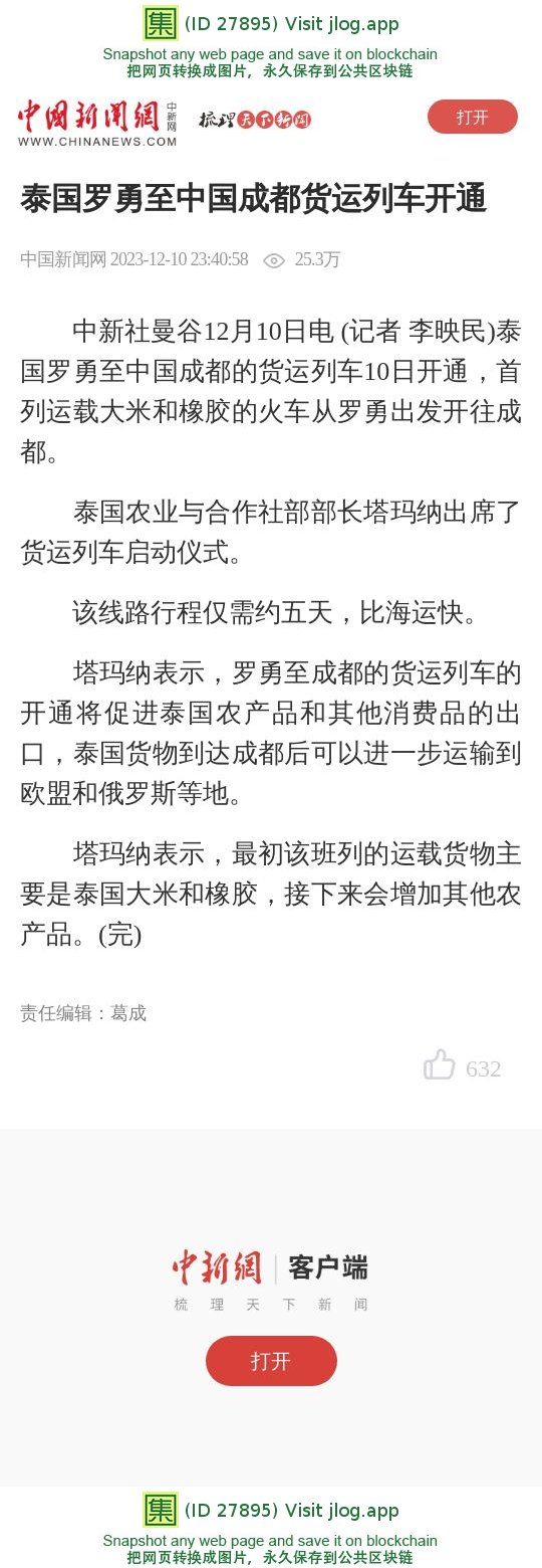 泰国罗勇至中国成都货运列车开通