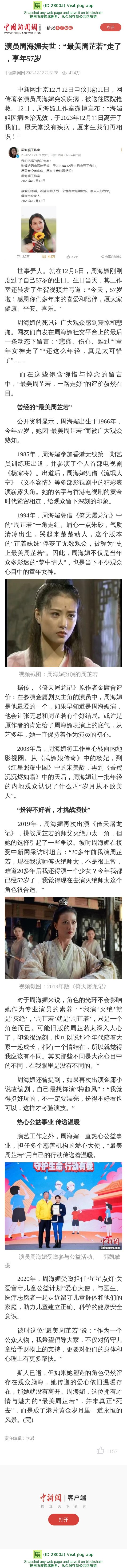 演员周海媚去世:“最美周芷若”走了 ,享年57岁