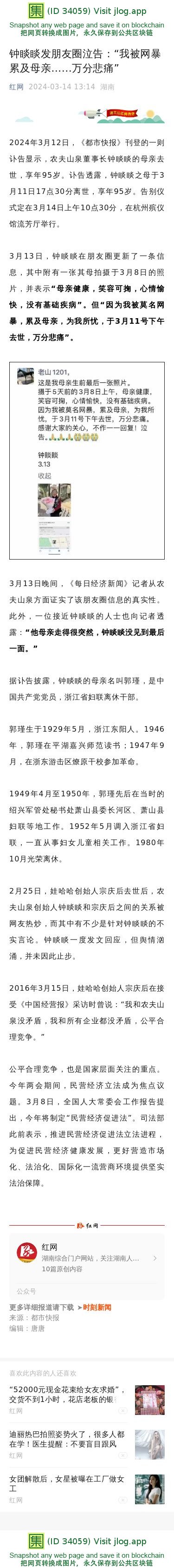 钟睒睒发朋友圈泣告:“我被网暴累及母亲…...万分悲痛”