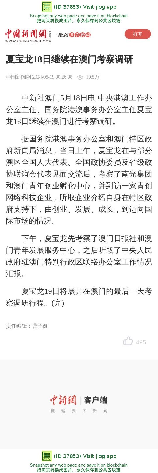 夏宝龙18日继续在澳门考察调研