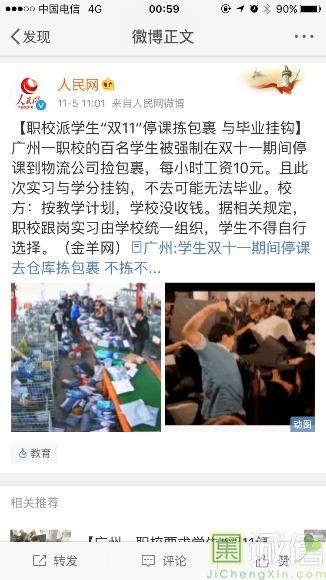 像这样双十一期间强制学生集体去物流公司实习的从去年好像就已经开始了 “阿里巴巴物流配送公司,包裹扫描,贴签。包吃住,10元/小时,每天工作八小时,有时工作十小时。11月1日—11月15日” 许多学生认为这根本就不合理。 有的学生认为学校回扣了许多,因为正常去外面打个零时工好一点的都可以达到18元/小时。 而在当地菜鸟物流大量招聘零时工的小时工价是一小时14元。15年出台的广州市最低工资标准,非全日制职工小时最低标准为18.3元一小时。 有的学生则需要考试,但是这个实习是强制性的,不去就没有学分,没有学分就没办法毕业。老师说考试的时候可以请假,但是考试前需要看书复习呀,前一天劳累工作第二天马不停蹄赶回来就考试对于学生来说太难。 但是学校老师的解释却是,因为有的学生在外面自己有兼职,所以不满意,毕竟这个实习会影响到他们自己的兼职。 “所有实习都是按照教学计划走的,不实习学分不修满就是不行。” “教学计划都是早在学生入校前就已经制定好的,都送往学校教务处通过,不存在违规问题” “这个每小时10元钱是补贴,不是工资,并且是企业直接给学生派发,不经手我们老师” “包住宿和午餐、晚餐,给学生锻炼锻炼不是很好吗?那些学生是在外面能拿到更多钱,但算算交通时间和成本,其实差不了多少” 老师还表示,如果有心脏病等的可以免除实习,而那两周的课在之后会用其他方法补回来,一种是专业课老师去现场指导学生活动当作抵课,另一种像思政课等的公选课则在以后随堂延时补回来,并不会影响学生的学业。 作为学生楼主是觉得很心疼这些学生的,但是根据记者特意查阅的有关文件,楼主去看了一下,2016年4月出台的《职业学校学生实习管理规定》对这方面有着明确的规定。 实习一共有三种:认识实习、跟岗实习、顶岗实习 这些学生的这类统一实习,是跟岗实习: