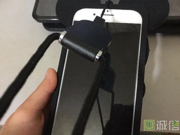 同时,挂脖手机壳,挂的地方最好选在手机下面的,这样挂在脖子上,拿起手机时比较方便。若是挂在手机上面,拿起手机时,会是下面这个样子,有绳子挡着。