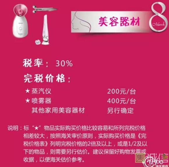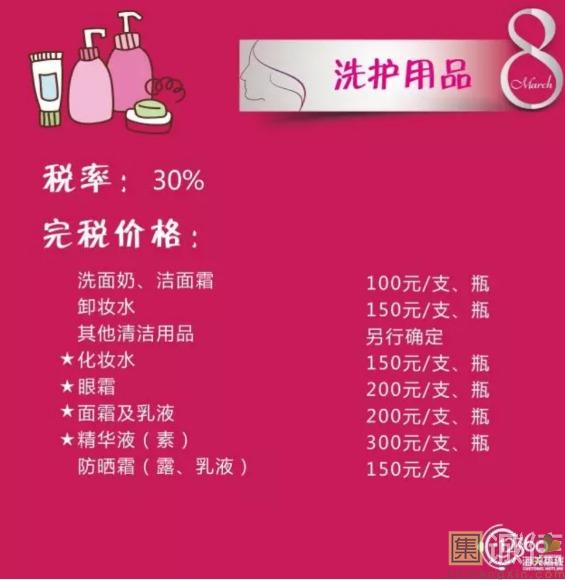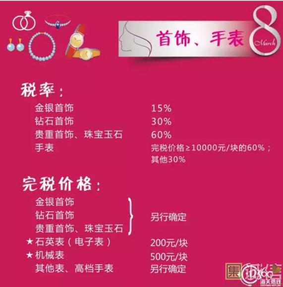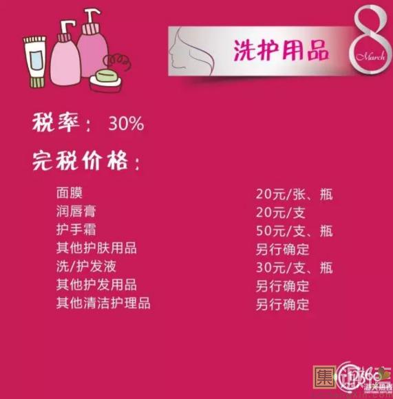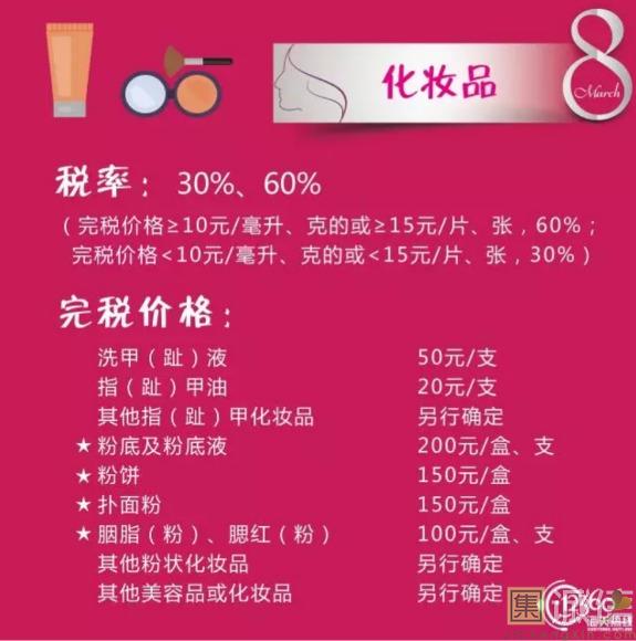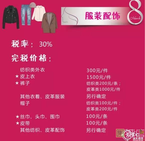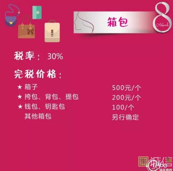来源:上海海关   ![]() 38 国际劳动妇女节 妇女节的起源 从1909年3月8日,美国芝加哥劳动妇女罢工游行集会以来,至21世纪已走过了百余年历程。在不同的地区,庆祝的重点有所不同,从普通的庆祝对女性的尊重、庆祝对女性的爱到庆祝女性在经济、政治及社会领域的成就。由于这个节日一开始是社会主义女权主义者发起的政治事件,这个节日和众多国家的文化都有融合,主要在欧洲,包括俄罗斯。 ![]() ![]() ![]() ![]() ![]() ![]() ![]() ![]() ![]() 当今社会,女神们都爱海淘什么?这些海淘物品的税率分别是多少?同是女神的小编帮大家整理归纳了下,快收藏啦!