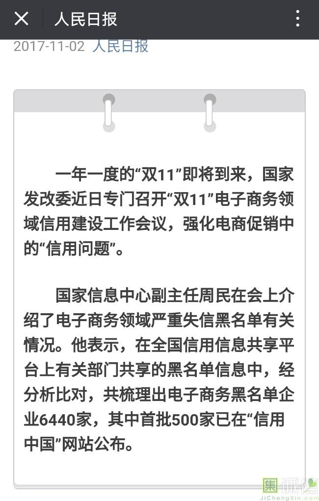 2017-11-02 核心提示: 国家发展改革委10月31日召开“双11”电子商务领域信用建设工作媒体通气会。在这次通气会上,国家发改委有关人士透露,目前发改委正会同中央网信办、工信部、公安部、商务部、工商总局、质检总局、海关总署等部门开展电子商务领域严重失信问题专项治理工作。 日前国家发改委召开“双11”电子商务领域信用建设工作会议,强化电商促销中的“信用问题”。国家发改委财政金融司副司长陈洪宛介绍,在“双11”前后,将发布电子商务领域黑名单,发布《电子商务领域信用风险“双11”预警报告》和《“双11”网络促销活动期间消费信用评估报告》。 “炒信”已经威胁到新经济的健康发展,也是社会信用体系建设过程中亟待解决的一个问题。一年一度的“双11”即将到来,严打“炒信”正当时。 ![]() 国家发展改革委10月31日召开“双11”电子商务领域信用建设工作媒体通气会。在这次通气会上,国家发改委有关人士透露,目前发改委正会同中央网信办、工信部、公安部、商务部、工商总局、质检总局、海关总署等部门开展电子商务领域严重失信问题专项治理工作。 在“双11”前后,将发布电子商务领域黑名单,发布《电子商务领域信用风险“双11”预警报告》和《“双11”网络促销活动期间消费信用评估报告》,指导中国互联网协会和“反炒信”联盟成员企业开展“反炒信、树诚信”活动,组织第三方机构对“双11”活动期间各主要电商平台的相关承诺兑现情况进行数据跟踪与测评分析,委托信用服务机构在产品质量、产品销售与服务、产品价格、物流服务等各环节开展信用监测,完善电子商务领域信用记录。 国家信息中心副主任周民介绍了电子商务领域严重失信黑名单有关情况。在全国信用信息共享平台上有关部门共享的黑名单信息中,经分析比对,共梳理出电子商务黑名单企业6440家,其中首批500家已在“信用中国”网站公布。 事实上,有些主流网购平台已经意识到了“炒信”的潜在危害,并采取必要的惩戒行动。日前由阿里巴巴、京东、腾讯、百度等八家企业共同组成的“反炒信”联盟举行了扩盟仪式,包括美团大众点评、唯品会、蜜芽等七家企业加入联盟,该联盟希望以“双11”为契机,强化电子商务领域信用建设。 一年一度的“双11”大战即将启幕,随着消费者在网购实践中积累的经验越来越多,人们最终会越来越青睐那些以诚信为本的平台。这意味着,如果电商平台不能尽早与涉嫌“炒信”的市场主体切割,最终将失去消费者信赖,失去未来。为长远计,严格落实“炒信黑名单”制度和联合惩戒机制,才是电商的正道。 来源:中国商网 中新社、凤凰财经、联商网、中国青年报