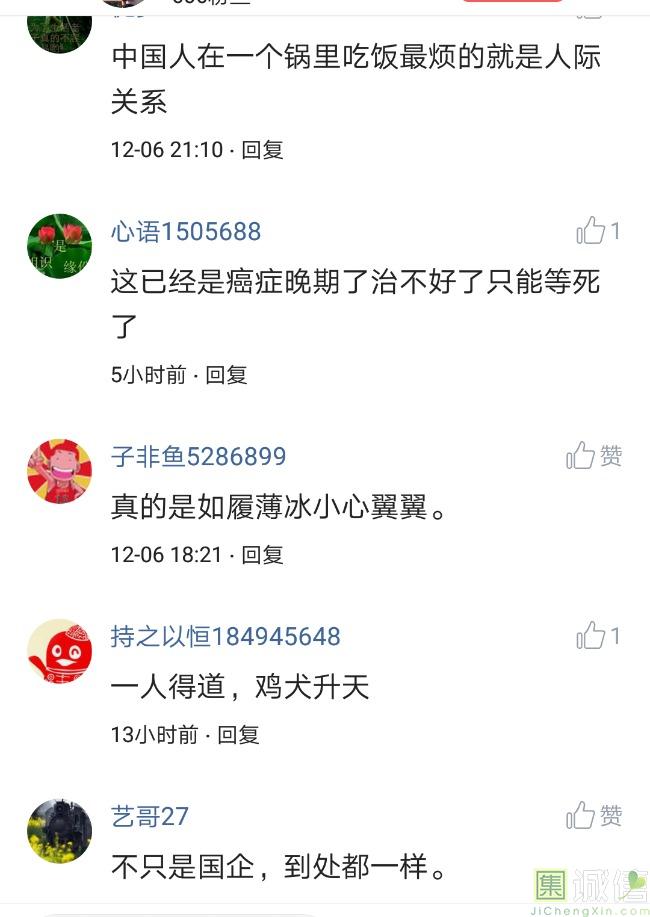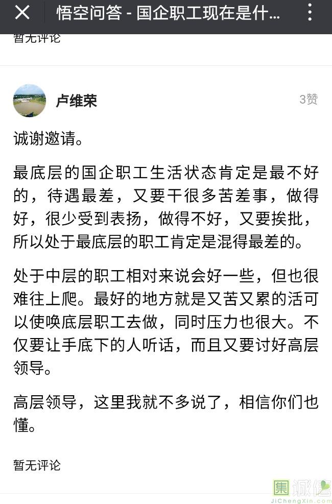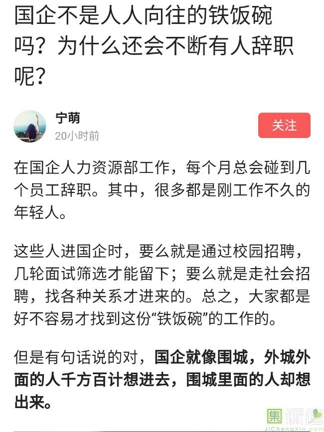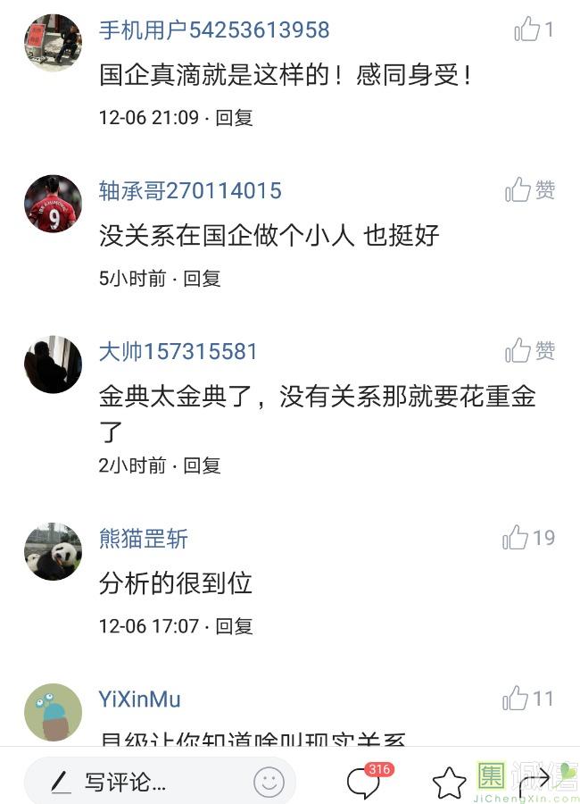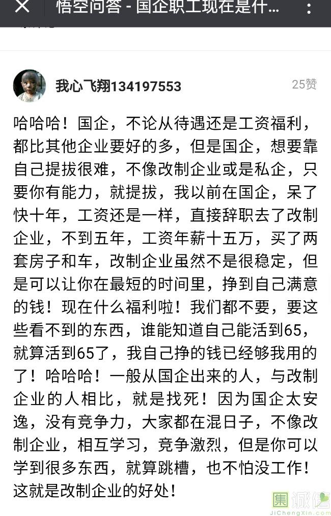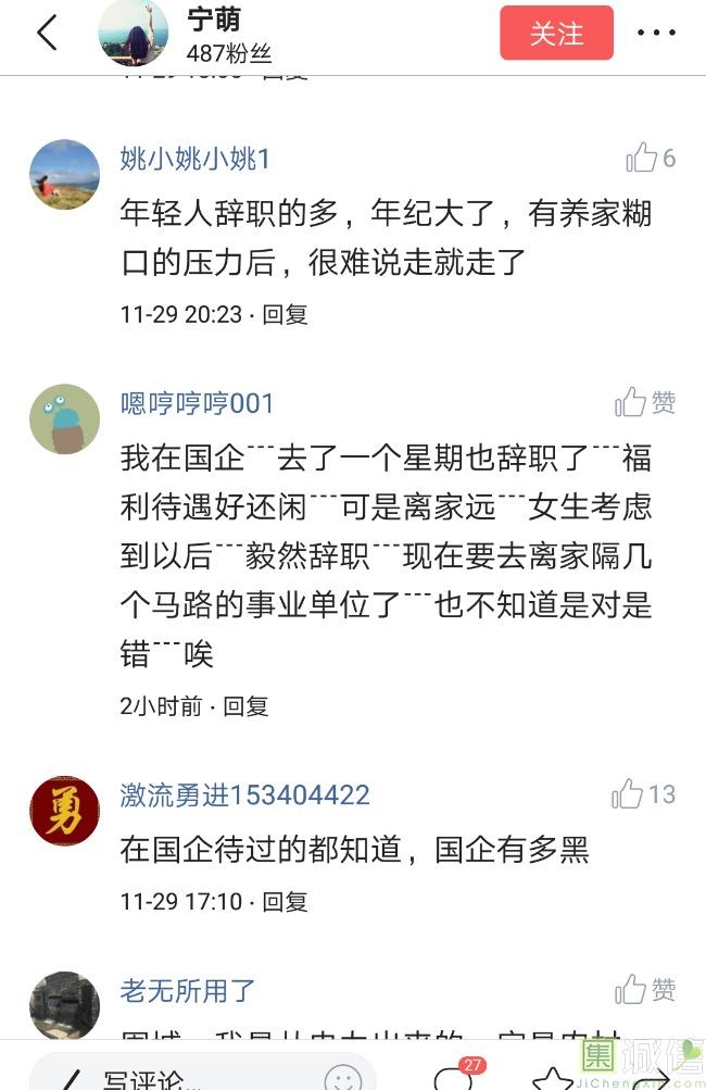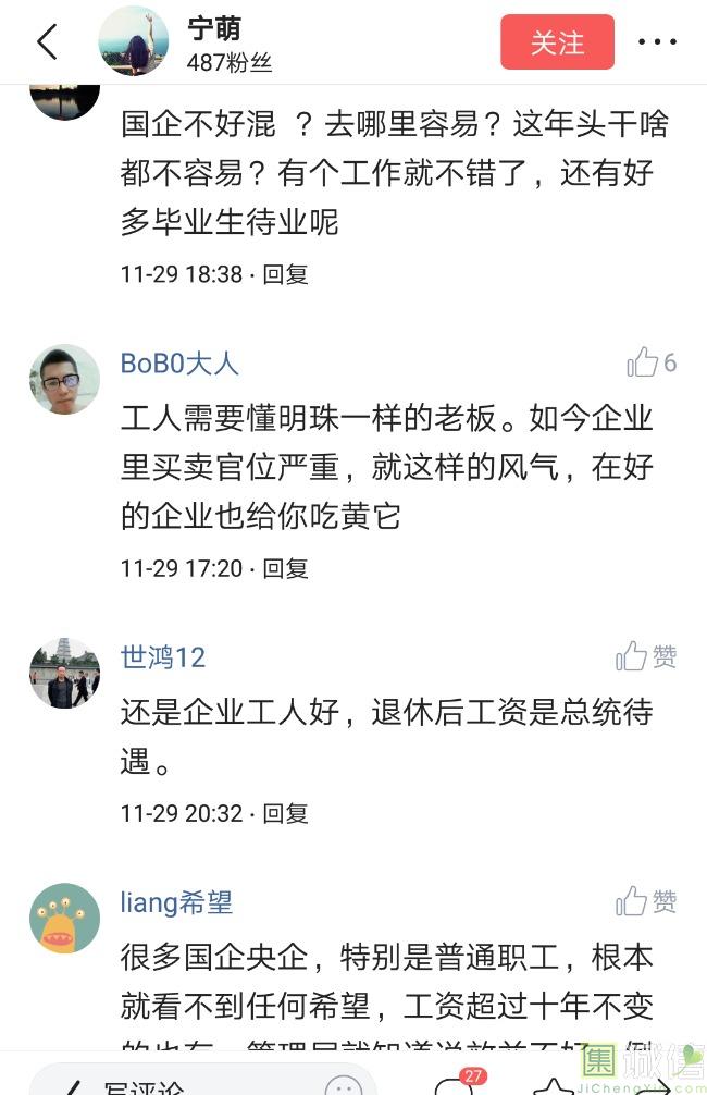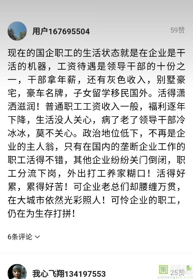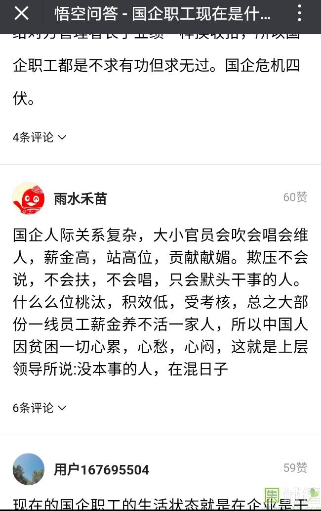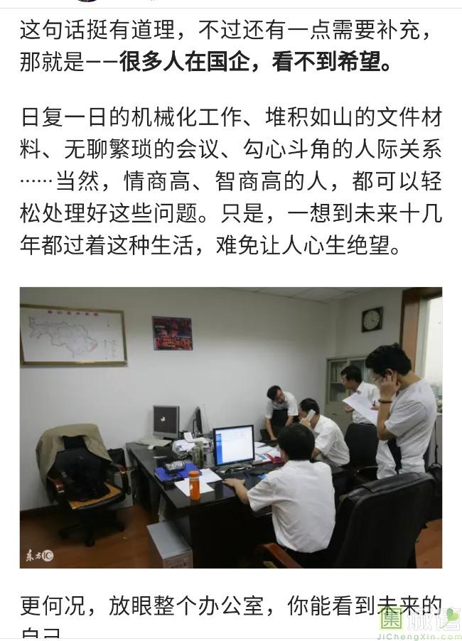 ![]() 我家是在一个县级市,有两个老牌国企,其中一个是做能源的,另一个是重汽。能源国企旗下化纤厂,十里厂区,规模相当于另一个小县城,里面的员工宿舍配备了健身房超市游泳池电影院医院和学校,效益好的时候我举个例子,过年过节厂长请大家来看放烟火,凡是到场的人不管大人小孩,一人50元红包。经常举办员工活动篮球赛网球甚至有自己的乐队,周年庆的时候请明星到场,养活了一大批人。 我父亲最早在里面通过奶奶的关系,混了一个轻松的岗位,带了一帮厂职工做小弟,后来因为打架斗殴,停薪留职下海经商。他当初那些小弟,有一大部分人还留在厂里,直到现在每年过节我父亲都会请他们聚在一起吃餐饭,通过每年的饭局就能切身感受到生活状态的变化。现如今硕大的厂区几乎全线停工,只在个别岗位安排了看守人员,电影院早在十年前就关闭了,医院发展成了市里的精神病医院,当初的员工宿舍大部分卖给了当地农民,反倒是学校成为了本市的另一所壹级达标,让生活区相对来说还不算是太冷清。当初的员工了大部分选择了辞职,或待业,出来当保安打零工,每每聚在一起谈论最多就是当初的效益怎么好怎么好过得多么的轻松有面,以及后悔的当初没有提早出来现如今四十多了,什么也不会,觉得制度废了他们后半生。朋友的父亲,在筛选厂,同样一个国企,当初煤价好时候,厂员工个个买车,一些跑业务的工资领一份外面再投资一些其他产业,同样有招待所篮球场,福利待遇很好。这几年煤价下跌,厂的效益大不如从前,无法自负盈亏,已经不再招聘新人了,从厂长助理以下无一例外,一批批的安排内退。我认为最让他们接受不了的,不是收入差距部分,而是面子,当初在厂里上班的和公务员一样铁饭碗,收益好的时候收入不菲,人人羡慕各个榜样,现如今的落差确实会让人心生不满。 再说一说和我同辈的一个朋友,90后,大学毕业之后,通过家里的关系,进了重汽。如今重汽相对来说还算稳定,产能正常,虽不能说前途光明,至少安逸稳定。比打工强,是大部分有一些关系的父母会让孩子去做的选择之一。但是我那朋友在去年的时候辞职了,一个人跑到外面的城市,和他姐夫做了金融,工资低且累但是充实。离职之前我请他喝酒,问他他父亲通过关系好不容易把它搞进去为什么要辞职,他和我说了两点: 1.有一位老员工二婚,请了整个部门所有的同事包括像他这样刚进去的菜鸟,他说他尼玛的连他面都没见过,请帖就到自己手上,让他觉得恶心。 2.二十看到老,对未来自己将会成为什么样的人,看看50岁老员工就知道,活着如同像一只蠕虫,每天不紧不慢吃不饱饿不死,朝九晚五穿着一身灰色的制服,开了几万块钱的车,抽得十几块的烟,每天扯些让人听腻了的家常,混得好的混个小管理,对新人指手画脚,多个五六百的工资,还要做个两面人。 对于辞职他是这样跟我说的:我知道自己没有本事也没有勇气去创业,但是我至少有选择自己生活的权利,我去帮亲戚打工,做自己认为相对有前途的事,也许刚开始收入不高,有上顿没下顿,但至少工作的时候我是有干劲的,我觉得是为自己而活,而不是像个机器一样在流水线上日复一日年复一年,我只是不想让未来的自己后悔罢了。这两件事就是我切身体会的,近距离交流分享出来的,目前国企的员工心里的想法和他们目前生活状态。每个时代都有每个时代的产物,我们都没有大智慧,看不懂现在的决定对未来的影响究竟是好是坏,但是我们还是要尊重自己内心深处的选择,人生在世百年载,如不能大起大落轰轰烈烈,那和咸鱼有什么区别呢? ![]() 摘自今日头条