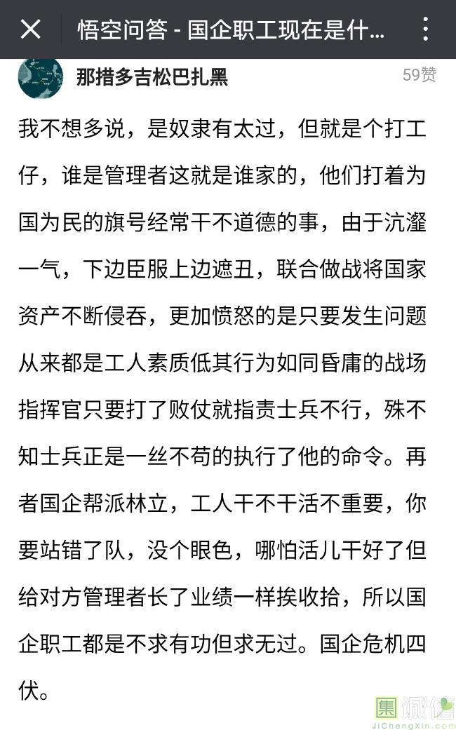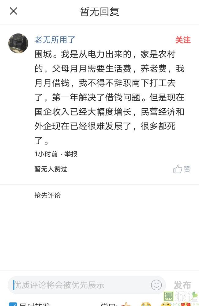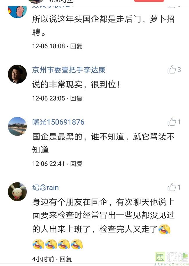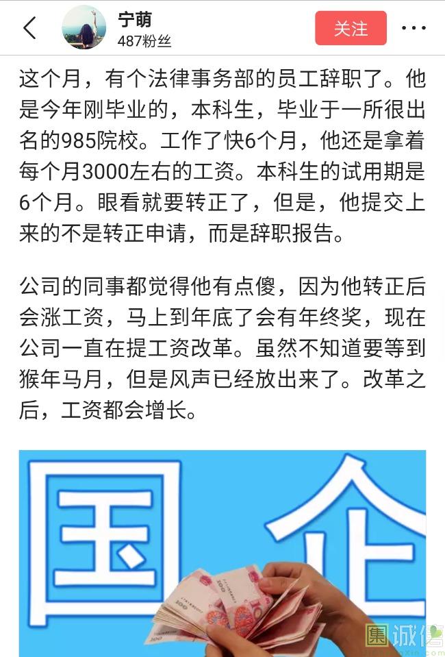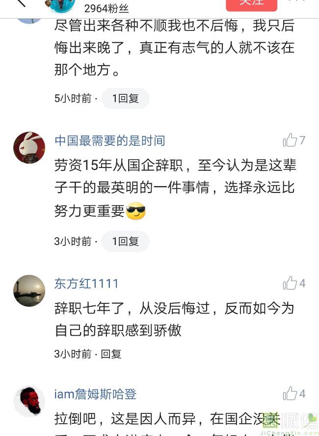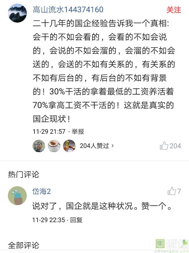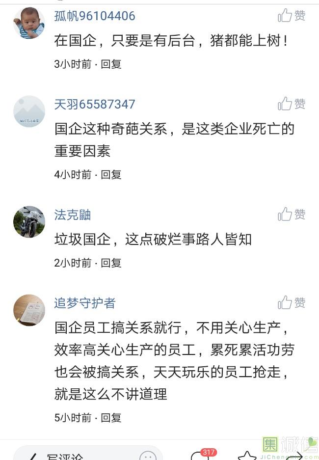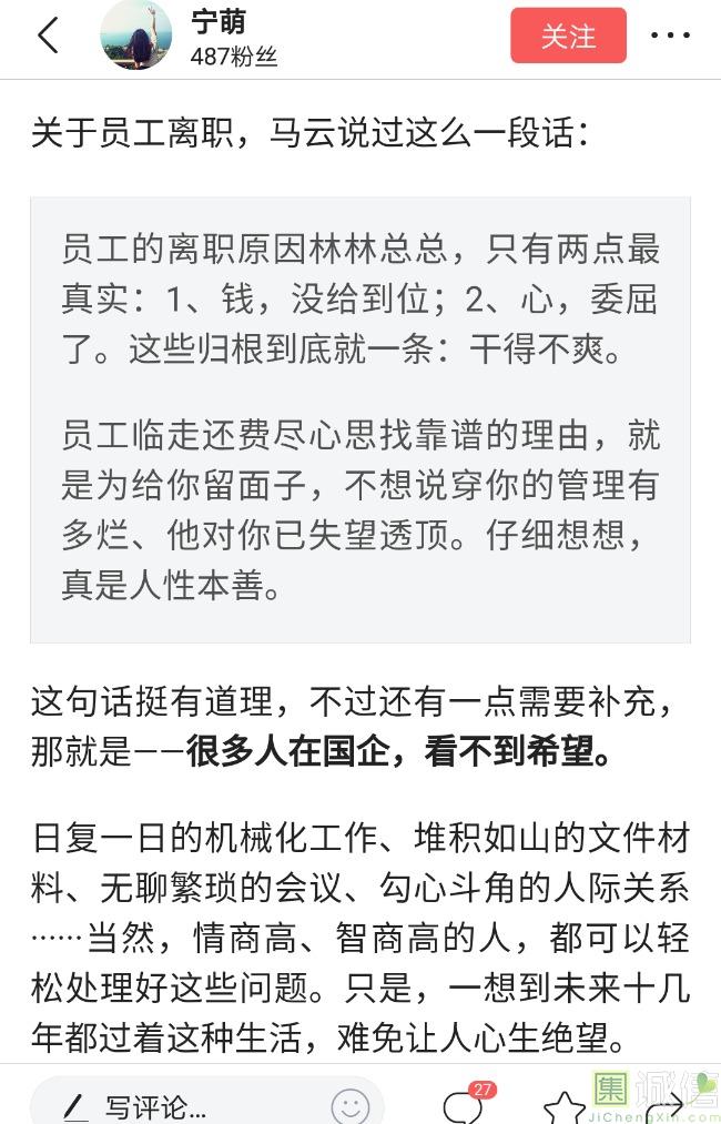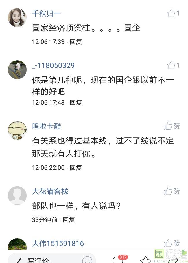 ![]() 我家是在一个县级市,有两个老牌国企,其中一个是做能源的,另一个是重汽。能源国企旗下化纤厂,十里厂区,规模相当于另一个小县城,里面的员工宿舍配备了健身房超市游泳池电影院医院和学校,效益好的时候我举个例子,过年过节厂长请大家来看放烟火,凡是到场的人不管大人小孩,一人50元红包。经常举办员工活动篮球赛网球甚至有自己的乐队,周年庆的时候请明星到场,养活了一大批人。 我父亲最早在里面通过奶奶的关系,混了一个轻松的岗位,带了一帮厂职工做小弟,后来因为打架斗殴,停薪留职下海经商。他当初那些小弟,有一大部分人还留在厂里,直到现在每年过节我父亲都会请他们聚在一起吃餐饭,通过每年的饭局就能切身感受到生活状态的变化。现如今硕大的厂区几乎全线停工,只在个别岗位安排了看守人员,电影院早在十年前就关闭了,医院发展成了市里的精神病医院,当初的员工宿舍大部分卖给了当地农民,反倒是学校成为了本市的另一所壹级达标,让生活区相对来说还不算是太冷清。当初的员工了大部分选择了辞职,或待业,出来当保安打零工,每每聚在一起谈论最多就是当初的效益怎么好怎么好过得多么的轻松有面,以及后悔的当初没有提早出来现如今四十多了,什么也不会,觉得制度废了他们后半生。朋友的父亲,在筛选厂,同样一个国企,当初煤价好时候,厂员工个个买车,一些跑业务的工资领一份外面再投资一些其他产业,同样有招待所篮球场,福利待遇很好。这几年煤价下跌,厂的效益大不如从前,无法自负盈亏,已经不再招聘新人了,从厂长助理以下无一例外,一批批的安排内退。我认为最让他们接受不了的,不是收入差距部分,而是面子,当初在厂里上班的和公务员一样铁饭碗,收益好的时候收入不菲,人人羡慕各个榜样,现如今的落差确实会让人心生不满。 再说一说和我同辈的一个朋友,90后,大学毕业之后,通过家里的关系,进了重汽。如今重汽相对来说还算稳定,产能正常,虽不能说前途光明,至少安逸稳定。比打工强,是大部分有一些关系的父母会让孩子去做的选择之一。但是我那朋友在去年的时候辞职了,一个人跑到外面的城市,和他姐夫做了金融,工资低且累但是充实。离职之前我请他喝酒,问他他父亲通过关系好不容易把它搞进去为什么要辞职,他和我说了两点: 1.有一位老员工二婚,请了整个部门所有的同事包括像他这样刚进去的菜鸟,他说他尼玛的连他面都没见过,请帖就到自己手上,让他觉得恶心。 2.二十看到老,对未来自己将会成为什么样的人,看看50岁老员工就知道,活着如同像一只蠕虫,每天不紧不慢吃不饱饿不死,朝九晚五穿着一身灰色的制服,开了几万块钱的车,抽得十几块的烟,每天扯些让人听腻了的家常,混得好的混个小管理,对新人指手画脚,多个五六百的工资,还要做个两面人。 对于辞职他是这样跟我说的:我知道自己没有本事也没有勇气去创业,但是我至少有选择自己生活的权利,我去帮亲戚打工,做自己认为相对有前途的事,也许刚开始收入不高,有上顿没下顿,但至少工作的时候我是有干劲的,我觉得是为自己而活,而不是像个机器一样在流水线上日复一日年复一年,我只是不想让未来的自己后悔罢了。这两件事就是我切身体会的,近距离交流分享出来的,目前国企的员工心里的想法和他们目前生活状态。每个时代都有每个时代的产物,我们都没有大智慧,看不懂现在的决定对未来的影响究竟是好是坏,但是我们还是要尊重自己内心深处的选择,人生在世百年载,如不能大起大落轰轰烈烈,那和咸鱼有什么区别呢? ![]() 摘自今日头条