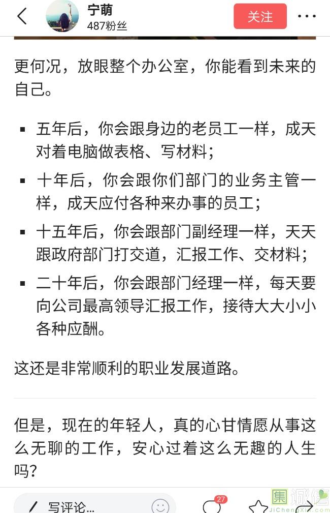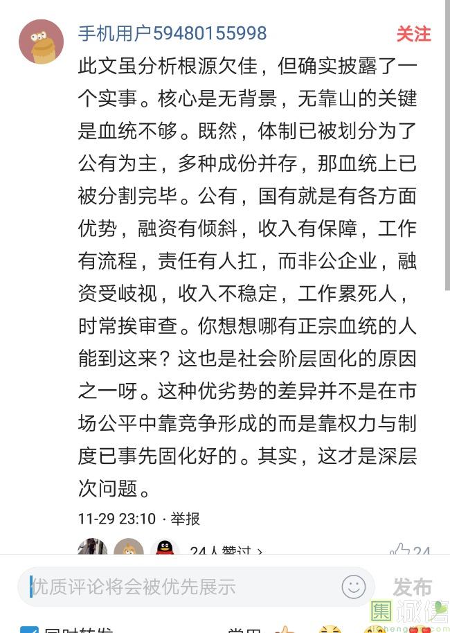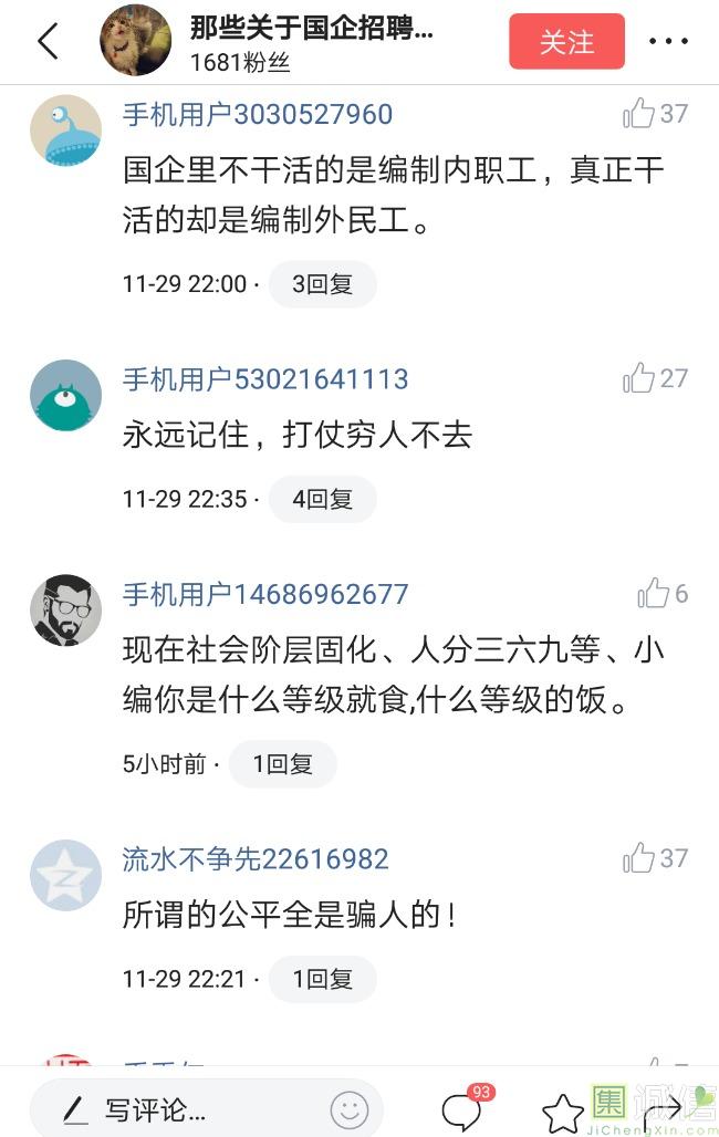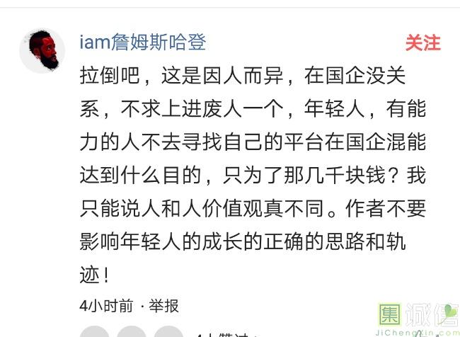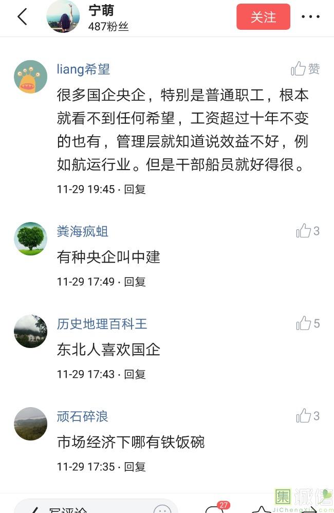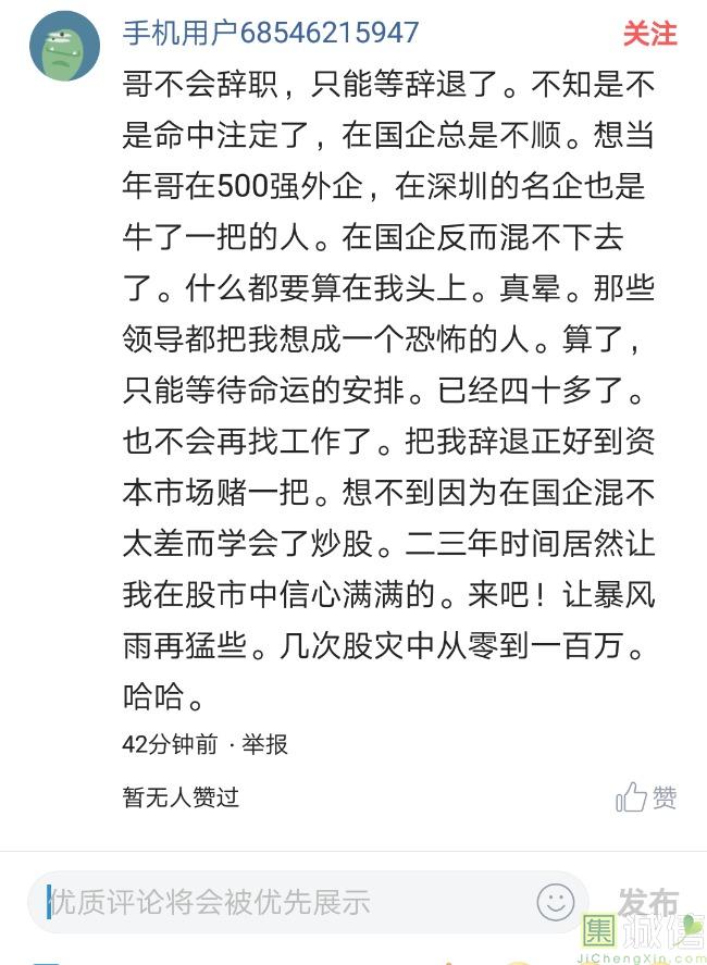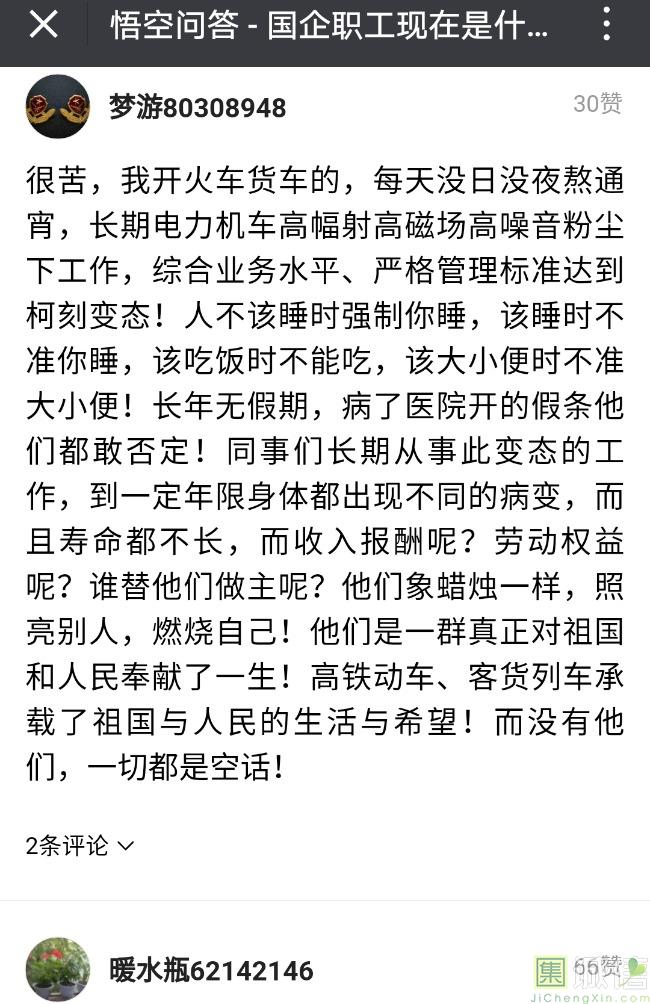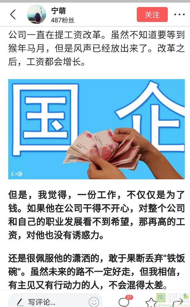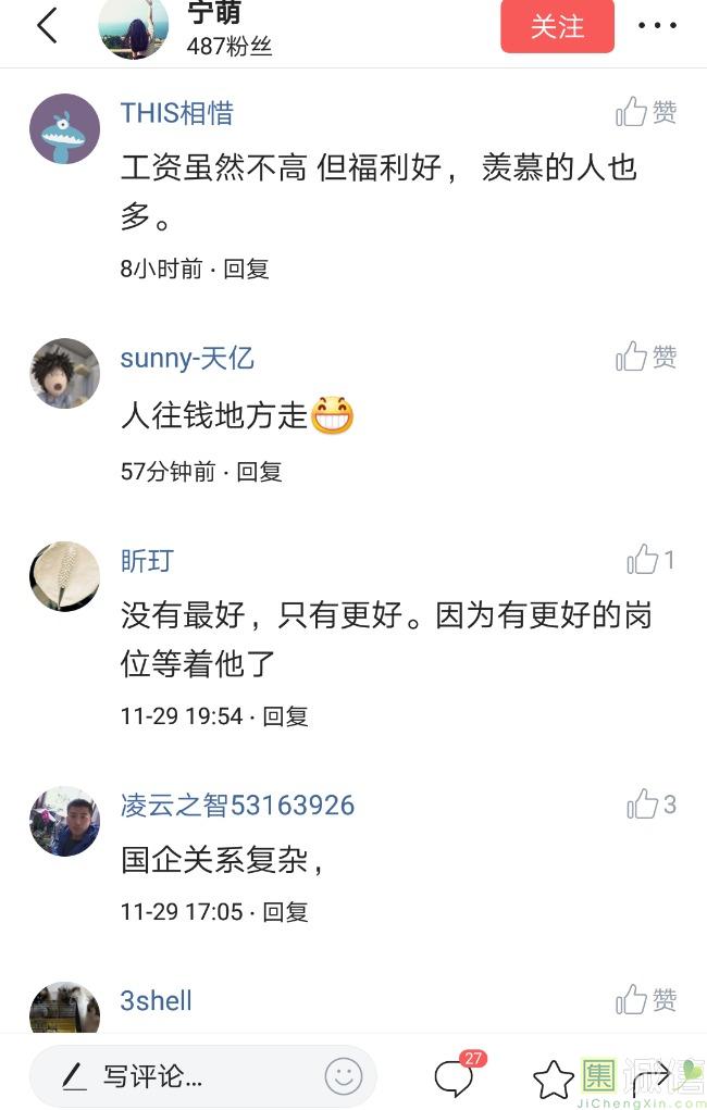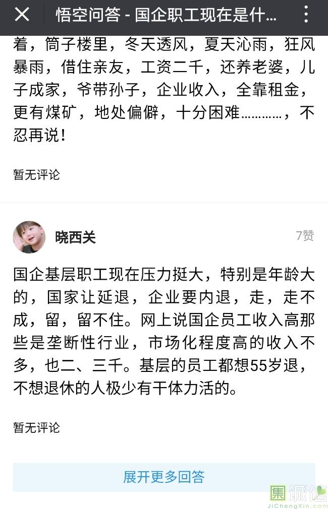 ![]() 我家是在一个县级市,有两个老牌国企,其中一个是做能源的,另一个是重汽。能源国企旗下化纤厂,十里厂区,规模相当于另一个小县城,里面的员工宿舍配备了健身房超市游泳池电影院医院和学校,效益好的时候我举个例子,过年过节厂长请大家来看放烟火,凡是到场的人不管大人小孩,一人50元红包。经常举办员工活动篮球赛网球甚至有自己的乐队,周年庆的时候请明星到场,养活了一大批人。 我父亲最早在里面通过奶奶的关系,混了一个轻松的岗位,带了一帮厂职工做小弟,后来因为打架斗殴,停薪留职下海经商。他当初那些小弟,有一大部分人还留在厂里,直到现在每年过节我父亲都会请他们聚在一起吃餐饭,通过每年的饭局就能切身感受到生活状态的变化。现如今硕大的厂区几乎全线停工,只在个别岗位安排了看守人员,电影院早在十年前就关闭了,医院发展成了市里的精神病医院,当初的员工宿舍大部分卖给了当地农民,反倒是学校成为了本市的另一所壹级达标,让生活区相对来说还不算是太冷清。当初的员工了大部分选择了辞职,或待业,出来当保安打零工,每每聚在一起谈论最多就是当初的效益怎么好怎么好过得多么的轻松有面,以及后悔的当初没有提早出来现如今四十多了,什么也不会,觉得制度废了他们后半生。朋友的父亲,在筛选厂,同样一个国企,当初煤价好时候,厂员工个个买车,一些跑业务的工资领一份外面再投资一些其他产业,同样有招待所篮球场,福利待遇很好。这几年煤价下跌,厂的效益大不如从前,无法自负盈亏,已经不再招聘新人了,从厂长助理以下无一例外,一批批的安排内退。我认为最让他们接受不了的,不是收入差距部分,而是面子,当初在厂里上班的和公务员一样铁饭碗,收益好的时候收入不菲,人人羡慕各个榜样,现如今的落差确实会让人心生不满。 再说一说和我同辈的一个朋友,90后,大学毕业之后,通过家里的关系,进了重汽。如今重汽相对来说还算稳定,产能正常,虽不能说前途光明,至少安逸稳定。比打工强,是大部分有一些关系的父母会让孩子去做的选择之一。但是我那朋友在去年的时候辞职了,一个人跑到外面的城市,和他姐夫做了金融,工资低且累但是充实。离职之前我请他喝酒,问他他父亲通过关系好不容易把它搞进去为什么要辞职,他和我说了两点: 1.有一位老员工二婚,请了整个部门所有的同事包括像他这样刚进去的菜鸟,他说他尼玛的连他面都没见过,请帖就到自己手上,让他觉得恶心。 2.二十看到老,对未来自己将会成为什么样的人,看看50岁老员工就知道,活着如同像一只蠕虫,每天不紧不慢吃不饱饿不死,朝九晚五穿着一身灰色的制服,开了几万块钱的车,抽得十几块的烟,每天扯些让人听腻了的家常,混得好的混个小管理,对新人指手画脚,多个五六百的工资,还要做个两面人。 对于辞职他是这样跟我说的:我知道自己没有本事也没有勇气去创业,但是我至少有选择自己生活的权利,我去帮亲戚打工,做自己认为相对有前途的事,也许刚开始收入不高,有上顿没下顿,但至少工作的时候我是有干劲的,我觉得是为自己而活,而不是像个机器一样在流水线上日复一日年复一年,我只是不想让未来的自己后悔罢了。这两件事就是我切身体会的,近距离交流分享出来的,目前国企的员工心里的想法和他们目前生活状态。每个时代都有每个时代的产物,我们都没有大智慧,看不懂现在的决定对未来的影响究竟是好是坏,但是我们还是要尊重自己内心深处的选择,人生在世百年载,如不能大起大落轰轰烈烈,那和咸鱼有什么区别呢? ![]() 摘自今日头条