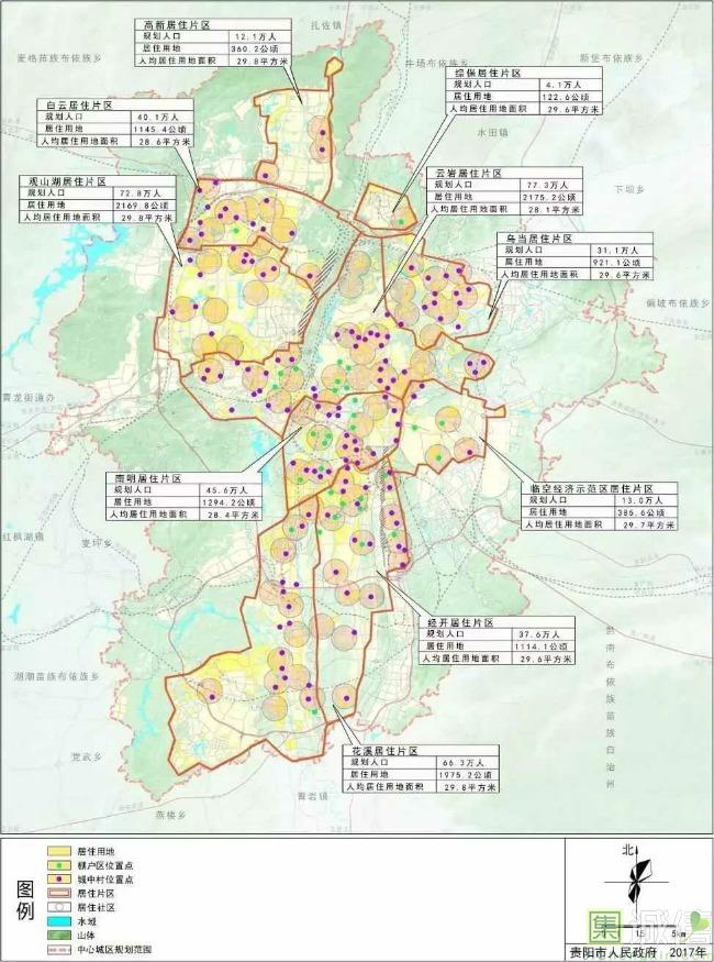网易房产贵阳 2018-01-11 近日,据贵阳市规划局消息称,《贵阳市城市总体规划(2011—2020年)》(2017年修订)已获国务院批准实施。规划显示,2020年贵阳市中心城区城市人口规模400万人;城市建设用地面积3.8亿平米,人均城市建设用地面积95平米。 中心城区居住用地规划图 ![]() 据悉,贵阳市中心城区总面积12.44亿平米:东起小碧乡、永乐乡、东风镇,西至朱昌镇、金华镇、久安乡、石板镇,南起党武乡、孟关乡,北至麦架镇、沙文镇、都拉乡。 旧城更新中的“旧城”主要指老城区:北至顺海公园、鹿冲关森林公园,西至黔灵山脉,东至南岳山、东山、相宝山,南至湘黔铁路,重点更新改造范围是由北京路、宝山路、解放路、浣纱路、枣山路围合的人口、建筑、功能高度集中区域。 在中心城区中,规划人口前三名分别为:云岩居住片区、观山湖居住片区、花溪居住片区,涉及规划人口合计216.4万人。三个居住片区的人均居住用地面积分别为:28.1平米、29.8平米、29.8平米。 而据规划图显示,贵阳市中心城区共包括32个棚户区位置点、134个城中村位置点。 云岩居住片区棚户区位置点8个、城中村位置点34个, 南明居住片区棚户区位置点8个、城中村位置点20个, 观山湖居住片区无棚户区位置点、城中村位置点11个, 花溪居住片区棚户区位置点2个、城中村位置点16个, 经开居住片区棚户区位置点9个、城中村位置点20个, 乌当居住片区无棚户区位置点、城中村位置点13个, 白云居住片区棚户区位置点1个、城中村位置点14个, 高新居住片区无棚户区位置点、城中村位置点3个, 综保居住片区棚户区位置点1个、无城中村位置点, 临空经济示范区居住片区棚户区位置点3个、城中村位置点3个。