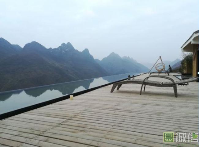 端着茶我走到了民宿中的最高层——四楼。四楼的景色是最值得推荐的。四楼的天井便有一个超大的露台,露台边沿注满了蓝盈盈的清水,在微风的吹拂下,层层的涟漪随着微风浮动就似在唱一曲柔和的音乐,但是露台周围是没有任何栅栏的,或许是民宿主人当初设计的时候就没有考虑到要安装栅栏,因为站在露台上远眺就是坝陵河大桥和巍峨的青山。或许是装上栅栏会影响整体的风景吧。