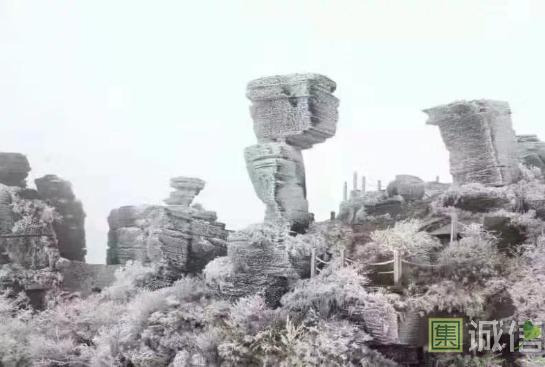 缆车缓缓的在缆线上滑动,满眼的大树小草都披上了银白的冬装,置身在银装素裹的世界里仿佛就如同在仙界一般。不知不觉缆车已到了梵净山的顶峰。