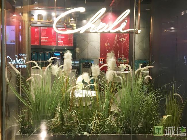 这是一家茶饮店的橱窗。如果不看招牌只看橱窗的话,第一印象可能会觉得这是一家花店或者绿植店。和我一起逛街的朋友开玩笑说,这个橱窗可以让店里卖的奶茶的价格从十几块升为几十块。