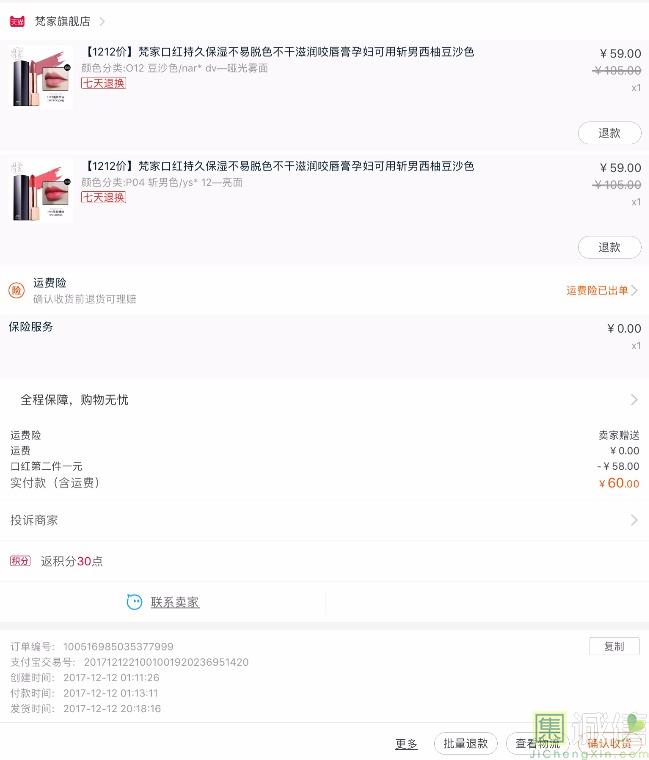 梵家口红,加1元得第二支,相当于买一送一。买了豆沙色和斩男色,豆沙色超级好看,可能因为是哑光雾面的,涂上不会反光,在润唇...