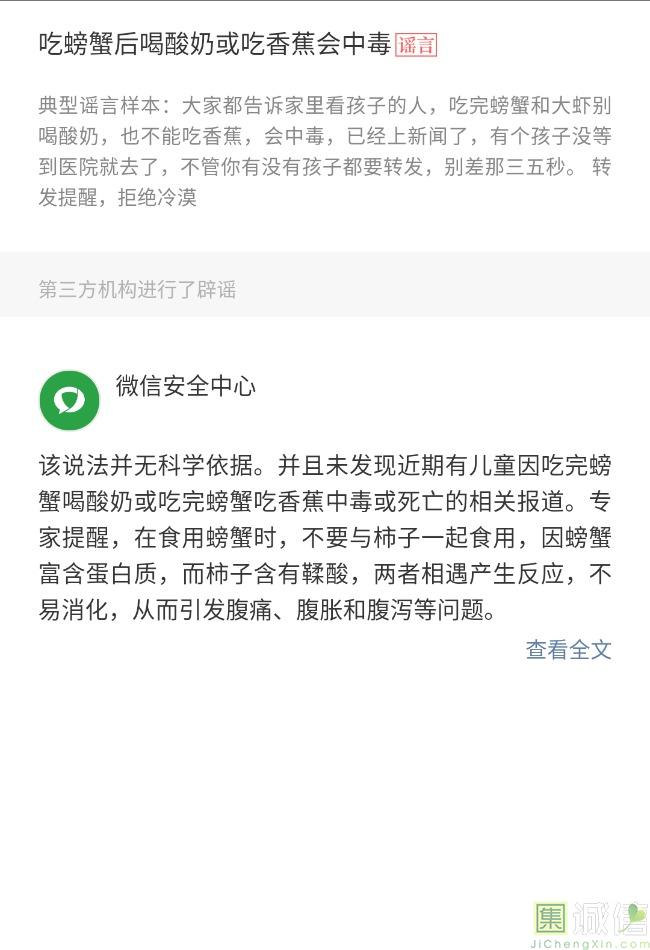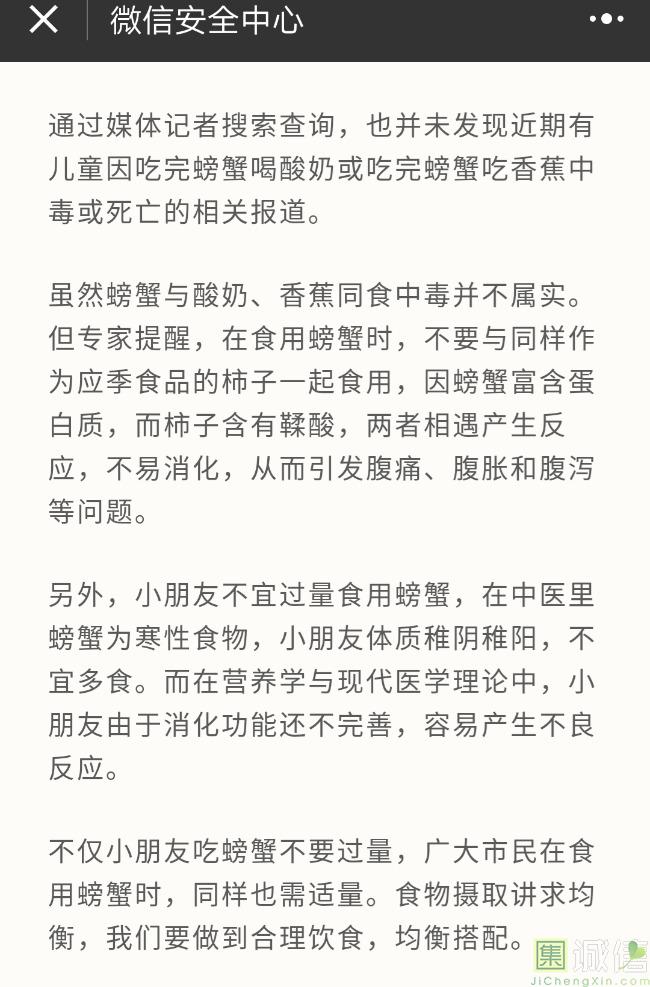 谣言很多,每月都有,你能识别吗? 蟹季,大家都告诉家里看孩子的人,吃完螃蟹别喝酸奶,也不能吃香蕉,也不能吃柿子否则中毒,...