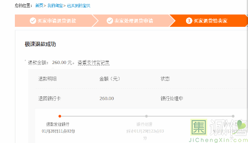 今天我按照淘宝小二的要求填写了退货速递单号,淘宝已将260.00元退到我的支付宝了,这次维权是成功的!