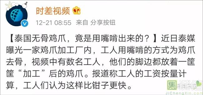 近日,泰国知名FB账号曝光了一段 小作坊加工“无骨鸡爪”的视频 工人用嘴啃的方式, 为鸡爪剔骨和去趾甲。 这种方式生产...
